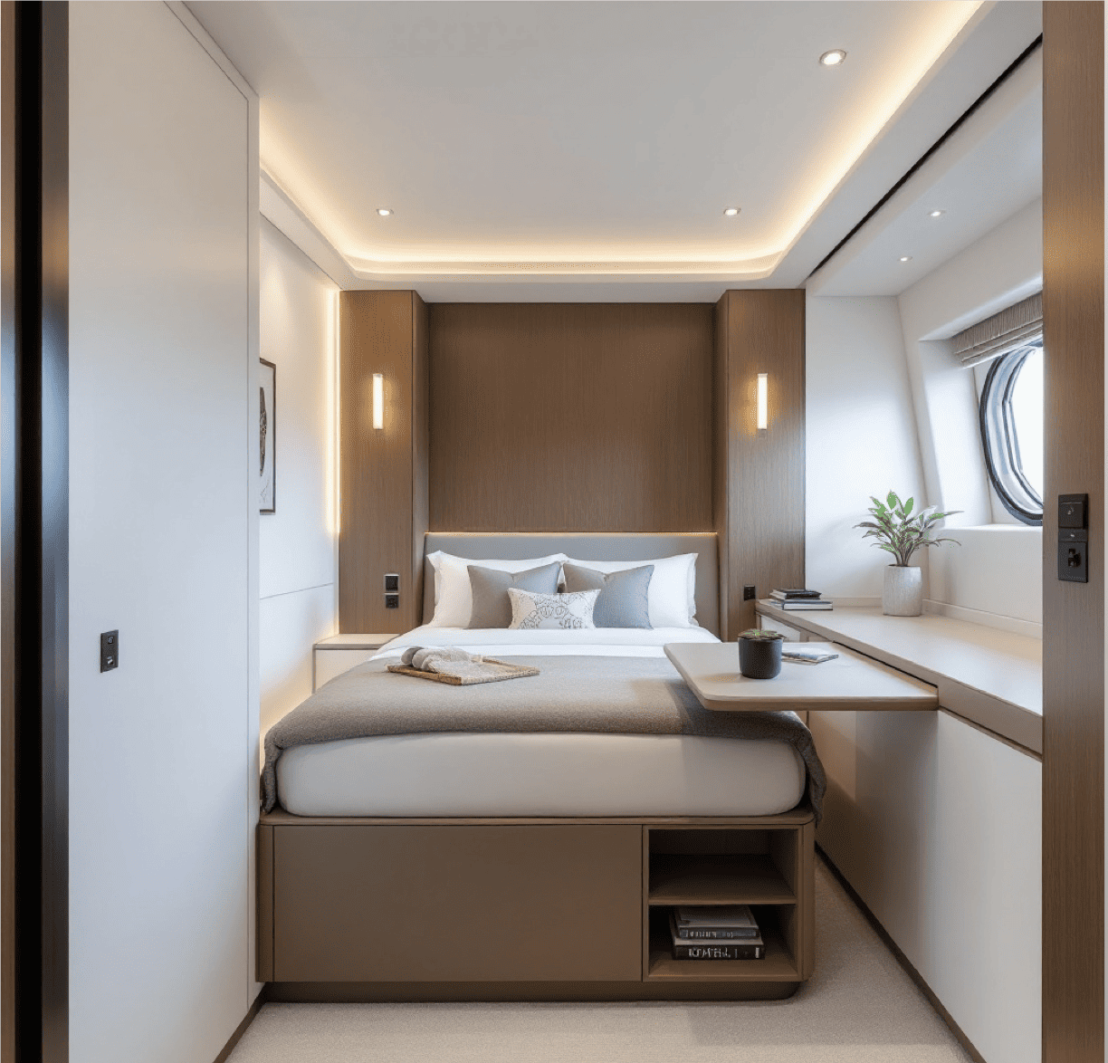 Escape 16’ün akıllı iç mekân planlaması, ferah salon alanları, ergonomik kabin düzeni ve fonksiyonel yaşam çözümleriyle kompakt ölçülerde maksimum verim sağlar. İç mekânda kullanılan malzemeler, hem dayanıklılığı hem de estetik zarafeti yansıtır; yat sahibinin beklentilerine göre kişiselleştirilebilir donanım seçenekleri sunar.