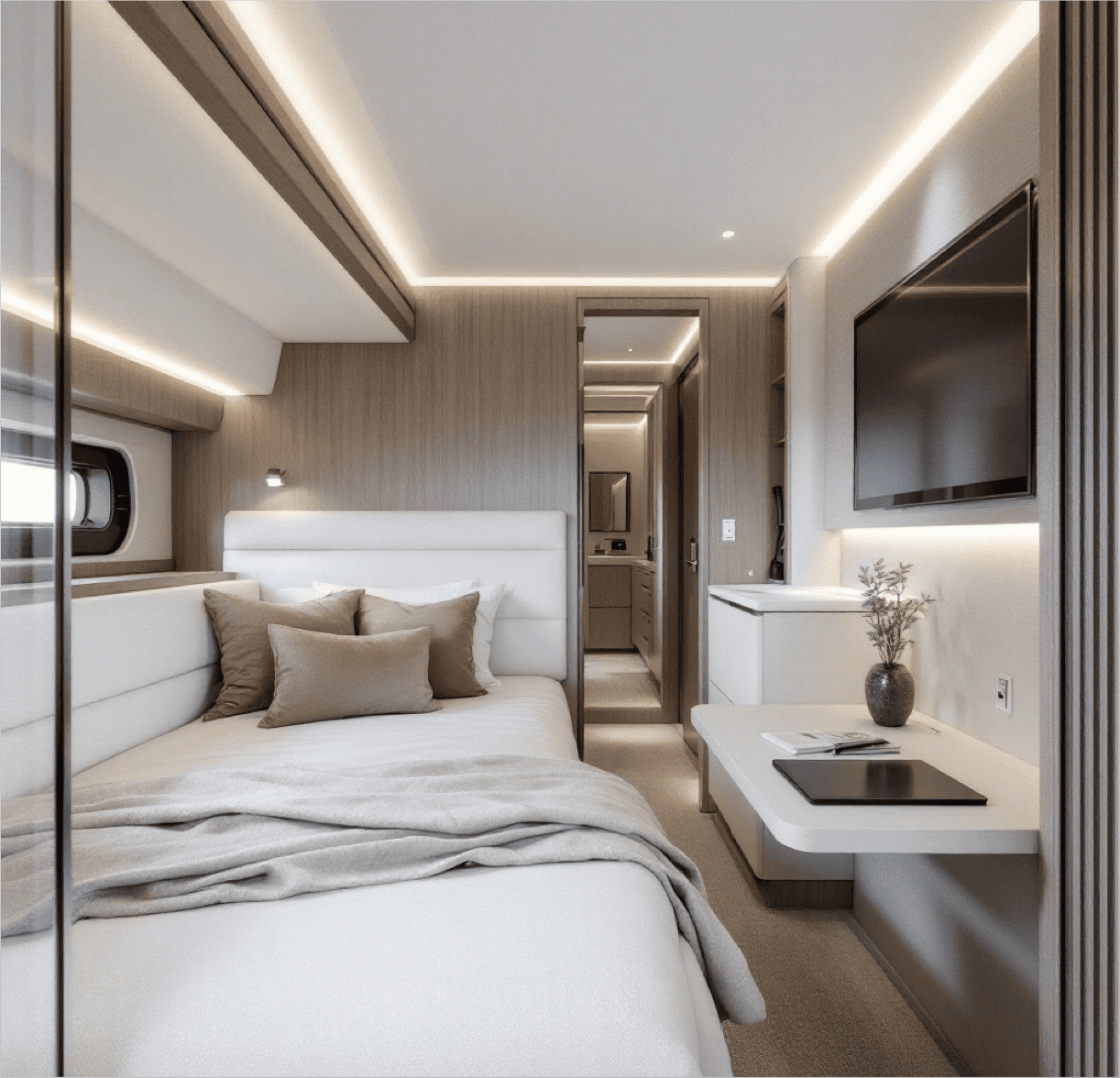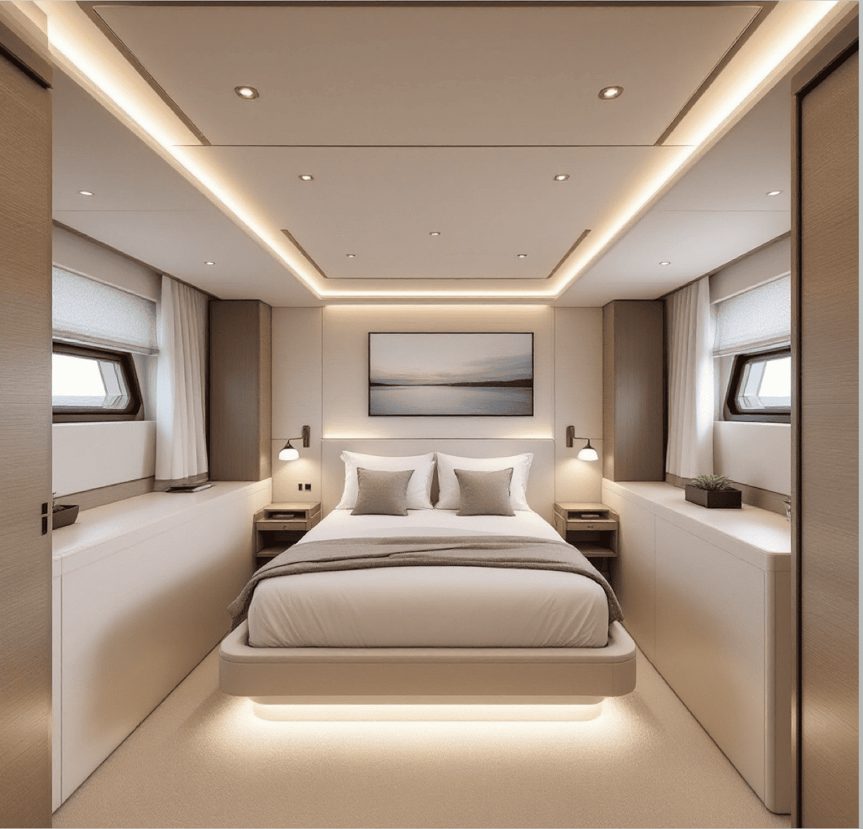Model; günlük kullanımlar, hafta sonu kaçamakları ve kısa–orta mesafeli seyirler için ideal olacak şekilde tasarlanmıştır. Akıllı planlanmış iç mekânlar, ergonomik yerleşim çözümleri ve fonksiyonel yaşam alanlarıyla kompakt ölçülerde maksimum verim sağlar. İç donanım ve malzeme seçimleri, yat sahibinin beklentilerine göre kişiye özel olarak şekillendirilebilir.