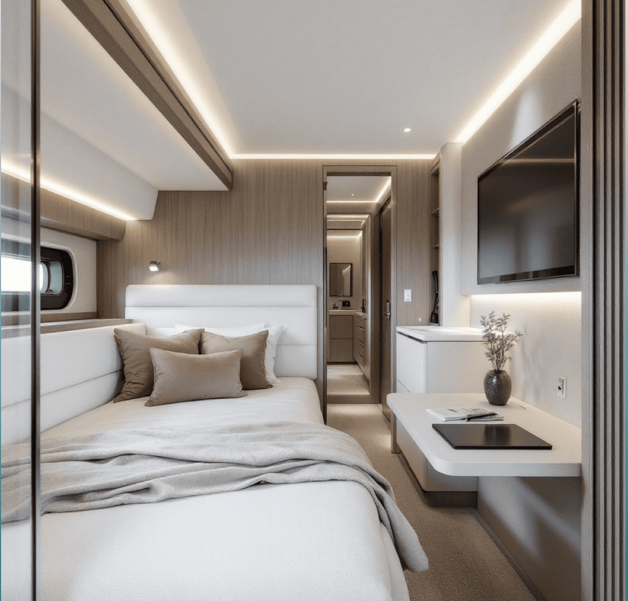 Voyage 78’in iç mekân planlaması, ferah salon alanları, konforlu kabinler ve sosyal bölümlerle denizde yaşam alanını ev konforuna yaklaştırır. Fonksiyonel yerleşim sayesinde her bölüm maksimum verimlilikle kullanılırken, kullanılacak malzeme ve donanım seçenekleri yat sahibinin tercihine göre kişiselleştirilebilir.